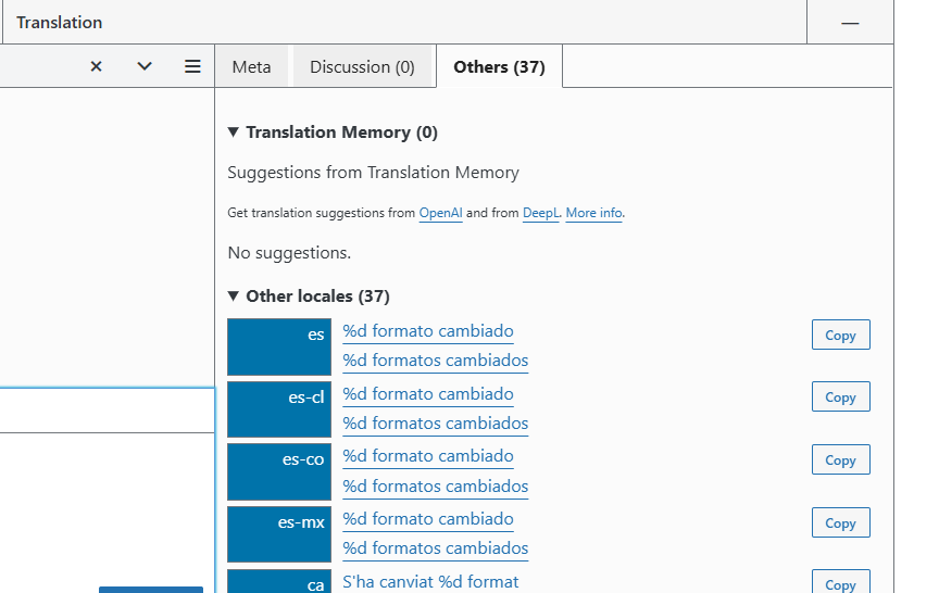 The way to do it is by taking at the «others» section to see alternative translations on the project, as a way to perform changes having a reference point on which translations work best for the developers and endusers.